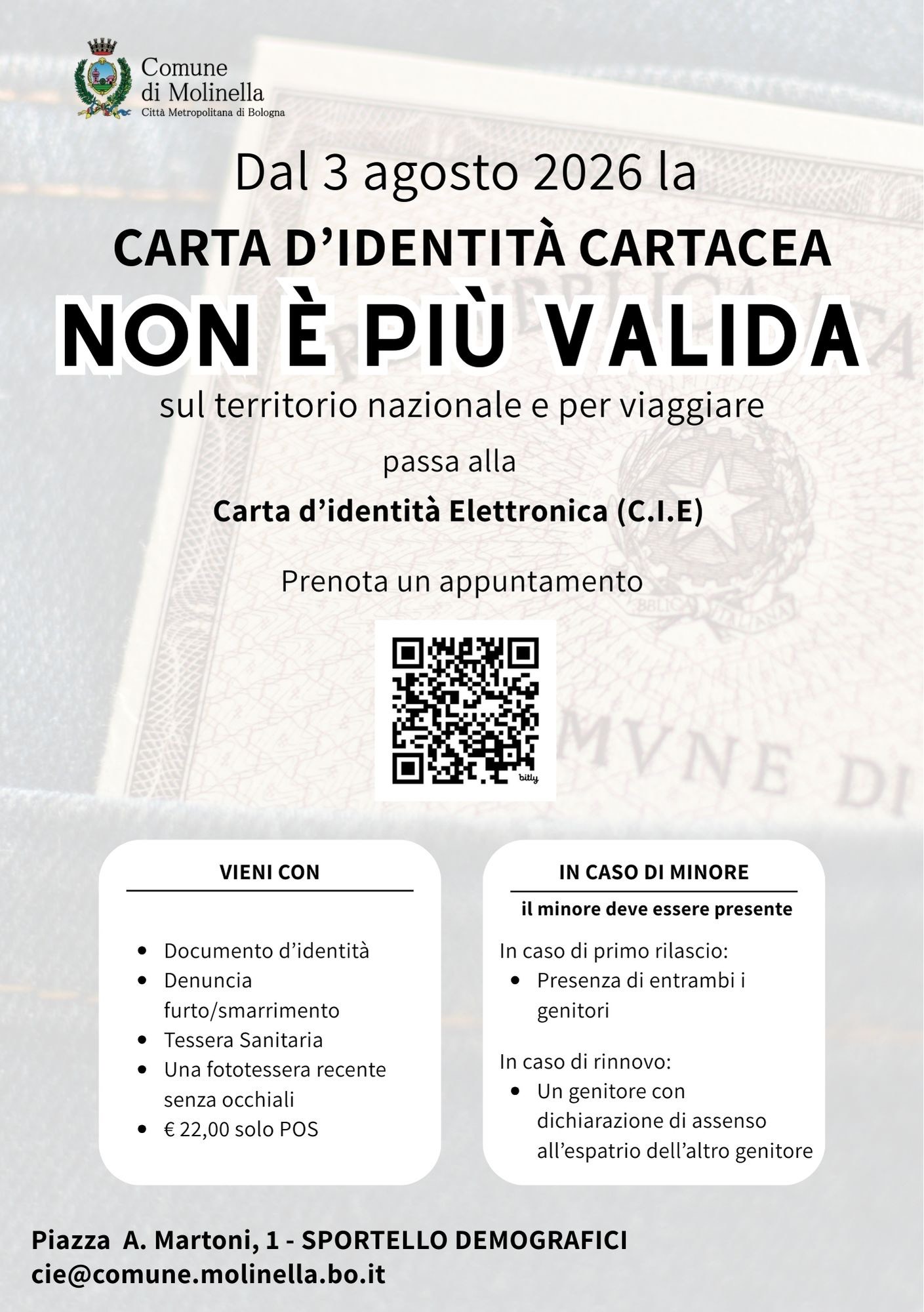 Chi avesse ancora una carta d’identità cartacea è invitato a programmare, per tempo, la sua sostituzione con la carta d’identità elettronica (C.I.E.) previo appuntamento presso lo Sportello dei Servizi Demografici: tutte le indicazioni sono disponibili nella locandina allegata.